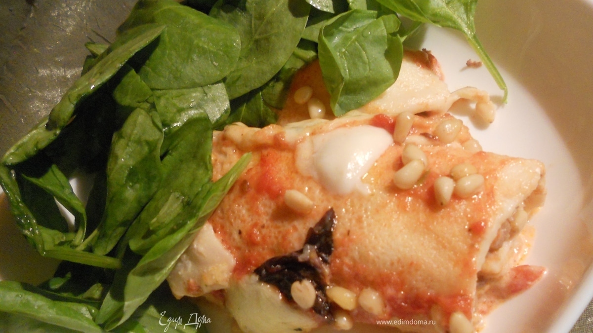 Достать форму, присыпать каннелони кедровыми орешками, моцареллой и козьим сыром и отправить в духовку еще минут на 10, пока сыр не начнет плавиться. ***Рекомендую подавать с зеленью - так оттенится вкус, да и у совести будет меньше поводов выпендриваться:))***