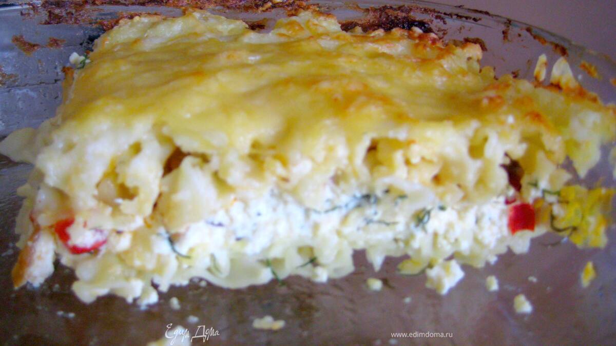 Собираем запеканку:Выкладываем в 2 слоя сваренную пасту на дно прямоугольной формы(у меня 25*15 см),сверху намазываем творожный крем. - Шаг 1