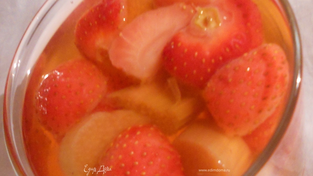 - Шаг 1Ревень при необходимости очистить ***чем моложе - тем меньше советую издеваться над ним***, клубнику порезать пополам/на четвертинки. Залить клубнику и ревень горячей (но не кипящей) водой - мл. 200 ***в это же время добавить лимонный сок и сахар. Мне было достаточно 1 ст.л. коричневого, прекрасно и без него - в общем, ориентируйтесь на свои вкусовые рецепторы и конечно же, спелость и сладость клубники*** Оставить минут на 30 настояться, затем долить воды и убрать в холодильник на несколько часов. ***Готовил я лимонад утром, перед работой. Вечером наслаждался потрясающим напитком - свежим, бодрящим, не приторным. Клубника уже успела отдать свой сок и цвет, размягчилась, ревень напротив же, сохранил свою хрусткость. В общем, запасайтесь лимонадом и не забудьте ложечку для прекрасного дуэта - это весьма душевно***:)))