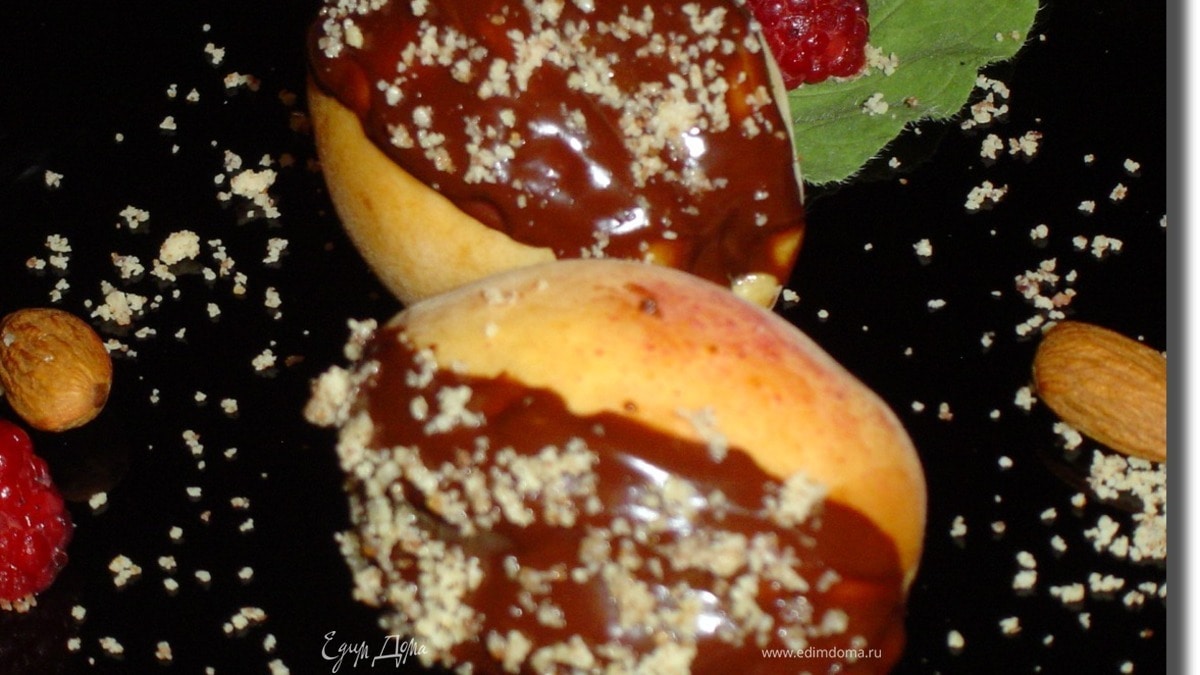 Из абрикос удаляем косточки. Разламываем на мелкие кусочки шоколад, добавляем к нему сливочное масло и топим его на водяной бане (топим отдельно черный и белый шоколад). Растопленным черным шоколадом наполняем одну из двух половинок абрикоса.На шоколад кладем миндаль. Вторую половинку наполняем белым шоколадом и сверху кладем малину.Соединяем две половинки и обмакиваем половину абрикоса в шоколаде.Сверху посыпаем тертым миндалем. Десерт готов! Приятного аппетита!!!