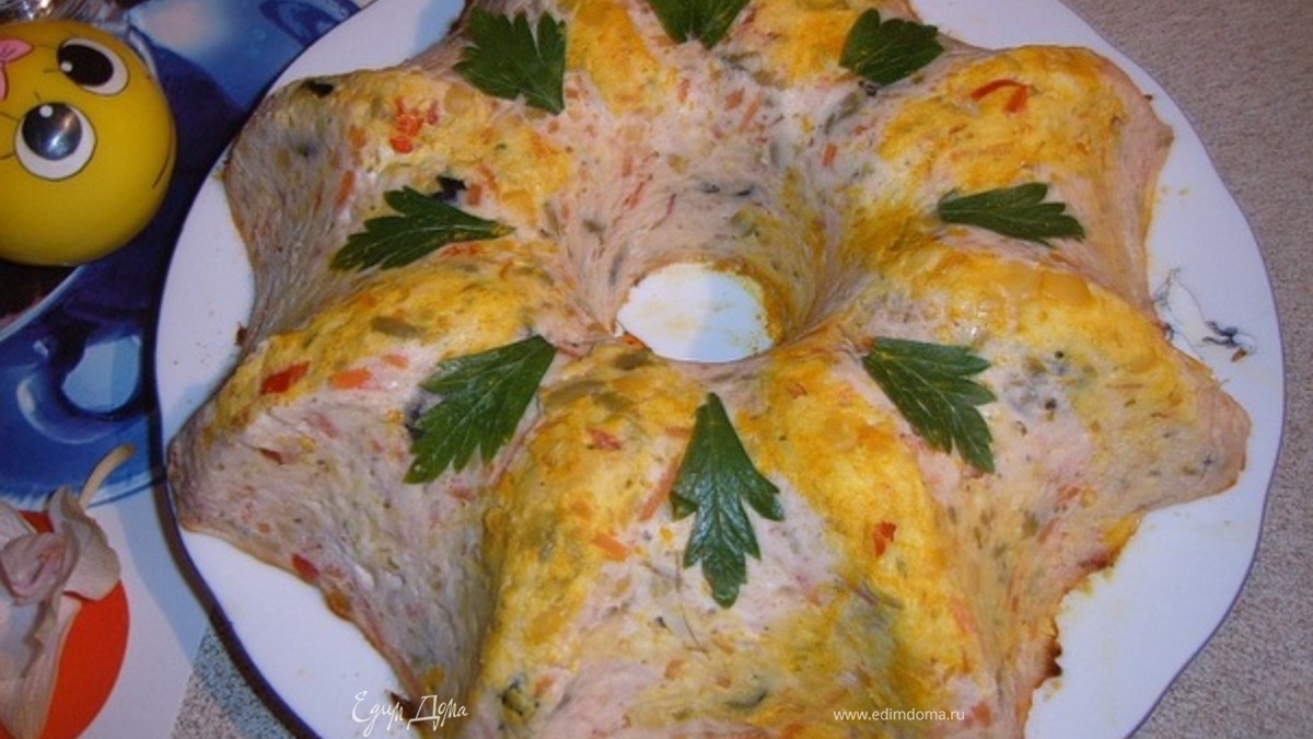 Измельчила в блендере сыр+корейскую морковь (морковку не обязательно, просто я люблю, чтобы было по-острее) Смешала с ними курицу, перец (порезанные кубиками) , маслины (порезанные колечками) кукурузу . В блендере взбила молоко+яйца+муку, смешала с остальными ингредиентами. Форму (у меня силиконовая) поместила в другую форму большего размера, куда подлила воды (примерно на 1/3). В предварительно разогретой до 200 градусов духовке запекала около 1 часа. Достала, слегка охладила, извлекла из формы и украсила петрушкой и присыпала карри. Получился мягкий, сочный и нежный.Приятного аппетита!