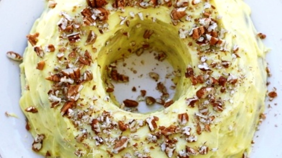 - Шаг 1Приготовить глазурь: Взбить сахарную пудру с маслом, добавить лимонный сок и пюре манго. Украсить орехами.