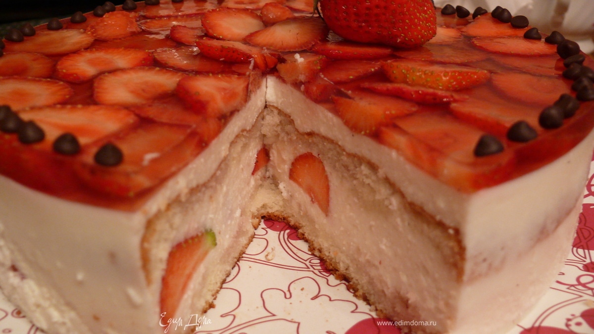 - Шаг 1готовим бисквит- взбиваем яйца с сахаром и ванильным сахаром,добавляем муку с разрыхлителем,тщательно взбиваем и выпекаем в разъемной форме(я накрыла его сверху фольгой на 20 минутах) и пекла в итоге-30минут. Бисквит вынуть,дать остыть и разрезать на 2-3 части.нижний корж выложить в разъемную форму. и полить клубничным соком Готовим творожное суфле: замочим желатин в воде до набухания. взбить сырки со сливками,сахаром,ванильным сахаром до образования однородной массы. Нагреем желатин до кипения и снимем с огня и дадим остыть. Затем добавим его медленно в творожную массу,тщательно взбить и сразу же начать заливать первый слой коржа, на этот слой выложить половинки клубники,затем накрыть следующим коржем и задить оставшейся массой. последний корж залить тонким слоем 5мм массы. Дать застыть в холодильнике (мин 30) пока застывает торт мы готовим клубнику-красиво нарезаем для укладки верхним слоем. Желатин замочить в 2 стаканах сока и добавить сахар, все нагреть до кипения (цвет измениться-станет бордовым ,как клубничное варенье) желе охладим, достанем торт и выложим клубнику и начинаем медленно(столовой ложкой) равномерно заливать клубнику. дать застыть (час) и украсить шоколадными каплями. ООООчень рекомендую! Этот торт очень нежный-не приторный и очень легкий,аромат клубники просто потресающий!торт улетает на "ура".