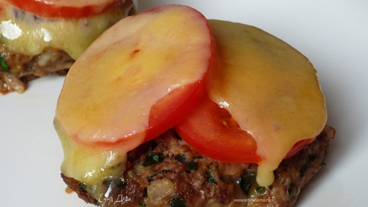 Вместе с жиром от жарки переложить в форму для запекания. Сверху положить помидоры, нарезанные кружочками, и сыр. Запечь в духовке пока сыр не расплавится (минут 5-8). - Шаг 1