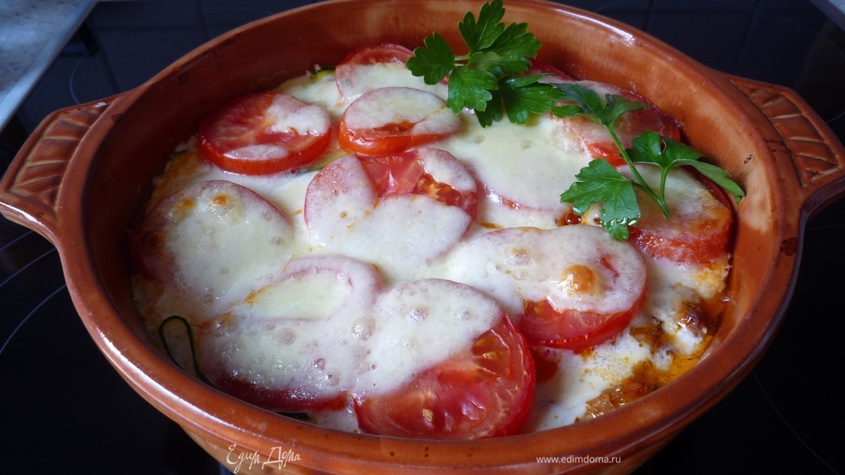 Вылить яйчную смесь. Сверху выложить слой томатов и моцарелла. Запечь 35-40 минут. - Шаг 1