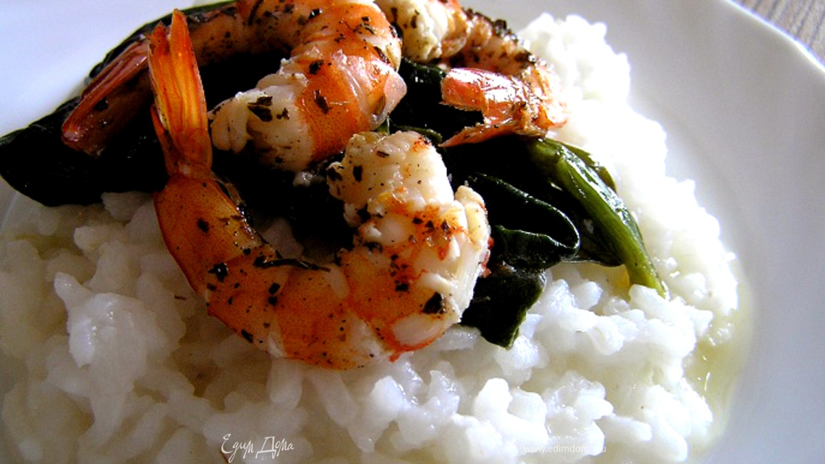 На поднос пароварки выложить листья шпината, сверху разложить креветки. Готовить на пару в течение 6-7 минут. Креветки можно подать с рисом.