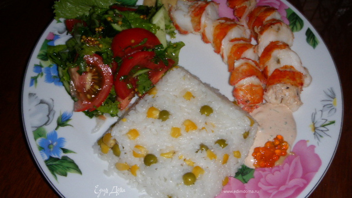 На гарнир можно подать салат, и рис отваренный на пару . Для большего вкуса и цвета в готовый рис добавляют консервированный горошек и кукурузу.