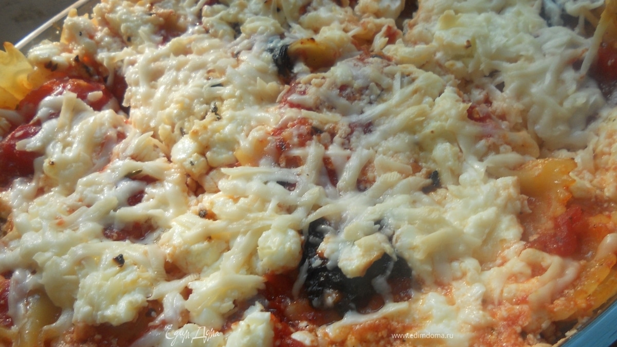 Поверх пасты распределить оставшиеся томатный соус и фету. Запекать 15 минут, поле чего присыпать тертым козьим сыром и отправить в духовку еще на 10-15 минут. Немного остудить и подавать:)