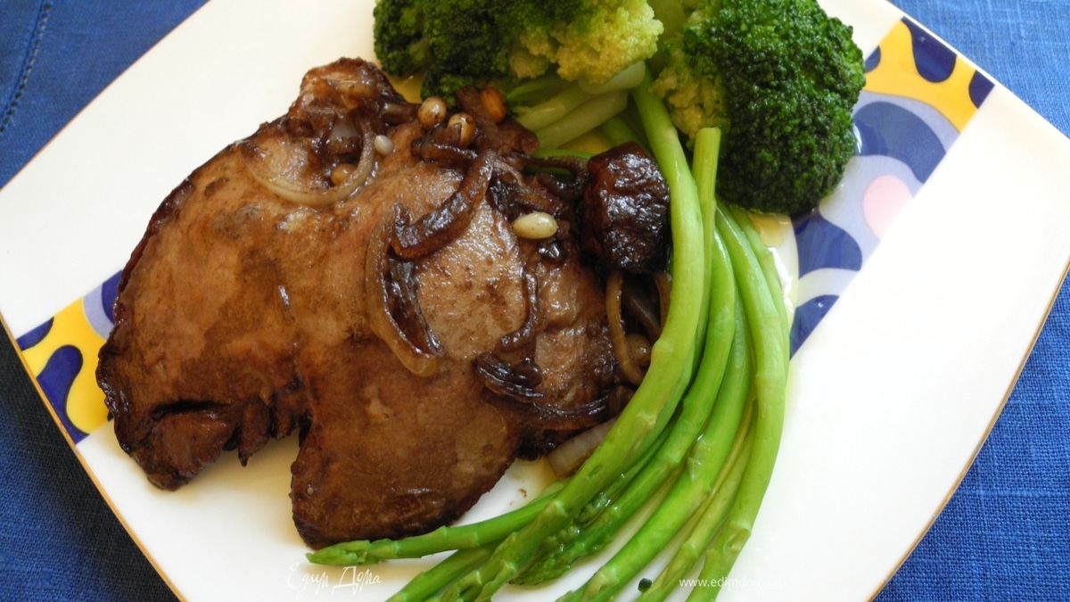 - Шаг 1Печень обвалять в муке, смешанной с солью и молотым черным перцем и обжарить в оливковом масле по 2 мин с каждой стороны, добавив нарезанный соломкой лук. Затем добавить бальзамический уксус, посыпать тимьяном и подержать на огне еще пару минут, чтобы все составляющие "переженились" Оставить отдыхать. В это время отварить в подсоленной воде в течение 3-5 минут брокколи, затем добавить спаржу и через минуту слить воду. Выложить печень на тарелку, присоединить к ней зеленую парочку из брокколи и спаржи, сбрызнуть лимонным соком овощи и полить оливковым маслом.