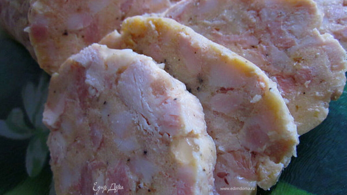 - Шаг 1Куриное мясо произвольно порезать, сало порезать мелко, смешать с остальными продуктами. Сложить всё в полиэтиленовый пакет, придать форму колбаски, положить этот пакет в другой, проклеить скотчем и варить на среднем огне 2 часа. Остудить в холодильнике не меньше 5 часов.