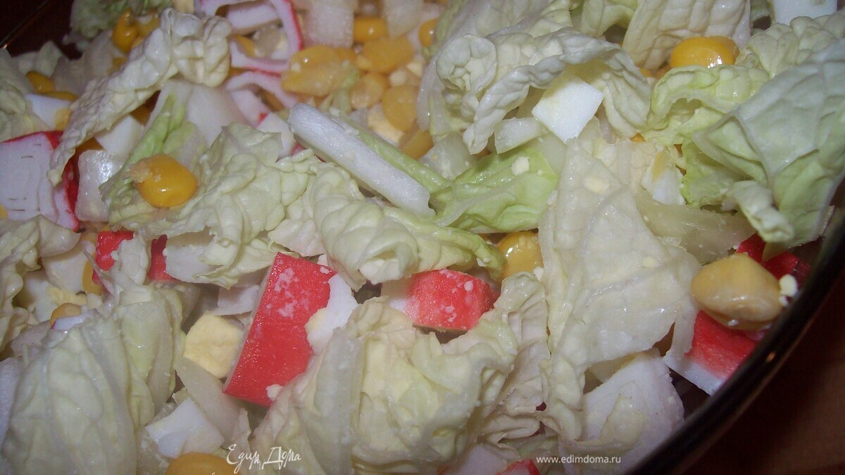 Салат из крабовых палочек вещь распространенная на наших столах. Обычно в него добавляют рис и заправляют майонезом. Думаю, что после употребления этого вкусного салатика на весы лучше не вставать..) Передлагаю облегченную версию всеми любимого салата..)