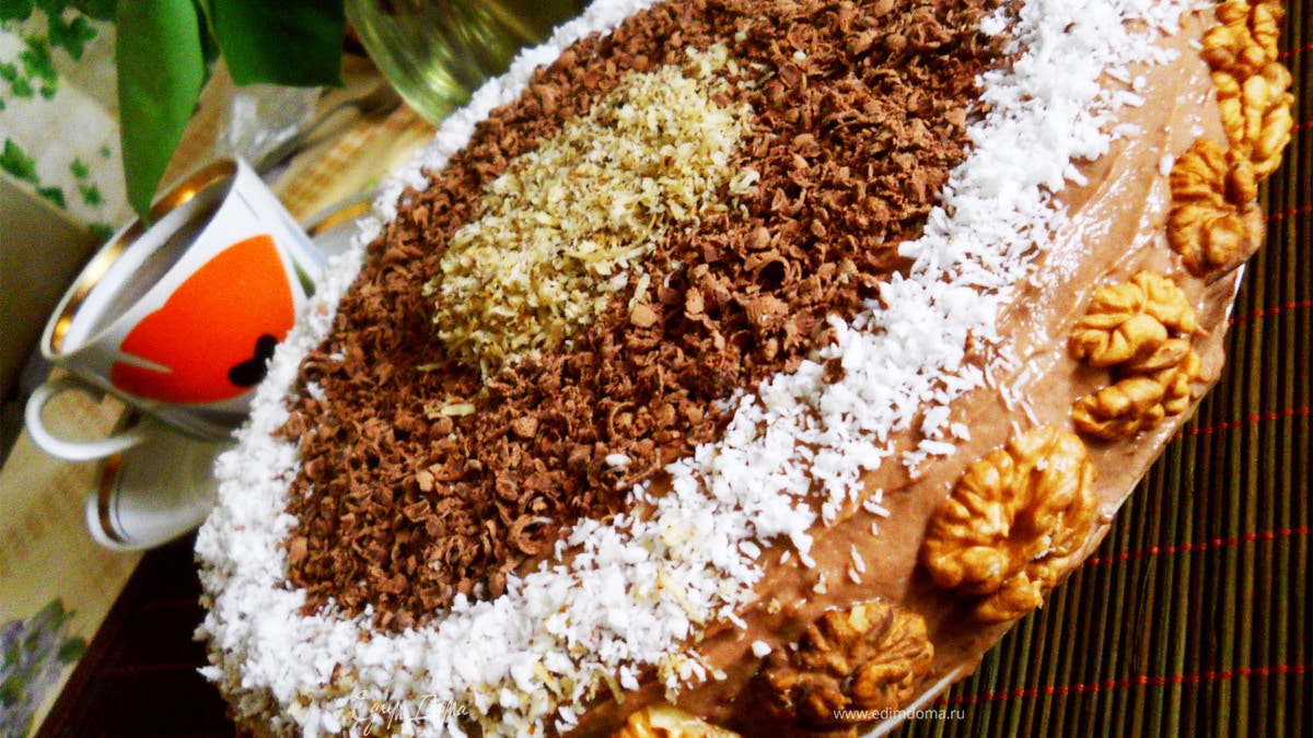 - Шаг 1Настоявшийся корж разрезаем на 2 части. Пропитываем. Нижний корж смазываем кремом, накрываем вторым коржом, смазываем верх и бока. Украшаем по желанию и по фантазии. Я посыпала тертым шоколадом и кокосовой стружкой. А бока украсила грецким орехом.Кстати, грецкий орех придает этому торту сказочный вкус. Торт готов! Приятного чаепития! =)