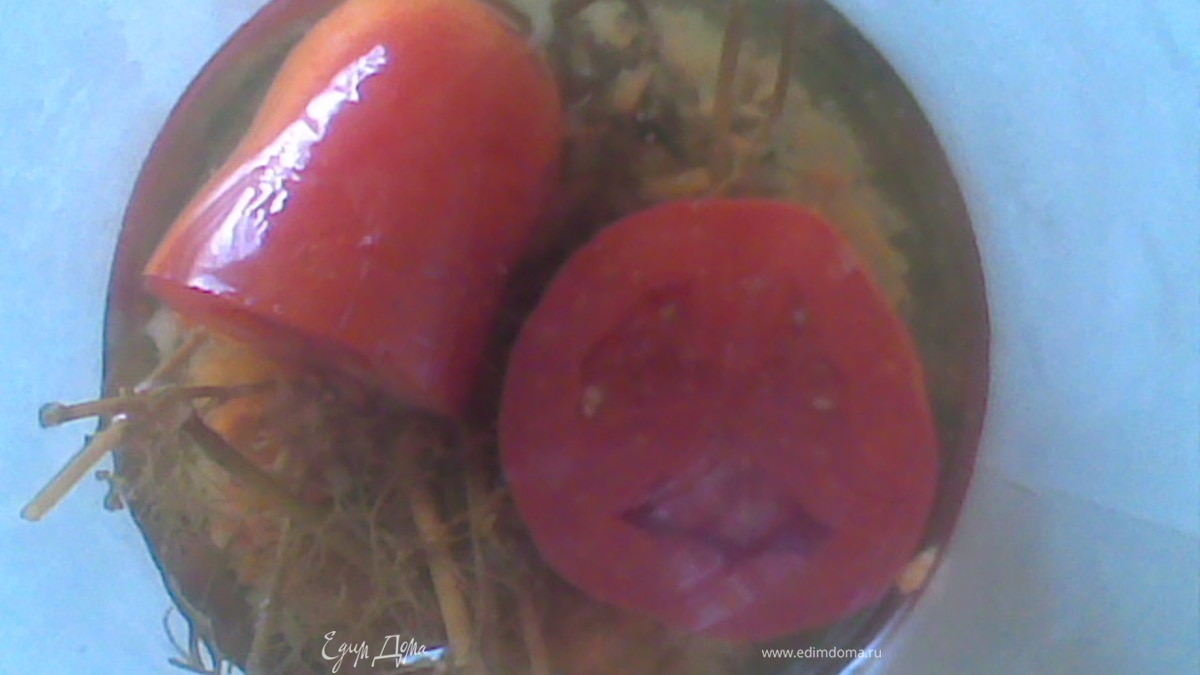 - Шаг 1Помидоры (лучше брать сливки) помыть, разрезать пополам или на четвертинки, уложить в банки с укропом. Залить кипятком и продержать 15 мин. Морковь и перец очистить и пропустить через мясорубку. Слить воду в кастрюлю, положить молотые морковь и перец, прокипятить 30 мин и добавить соль, уксус и сахар. Размешать до полного растворения. Залить рассолом помидоры и сразу закатывать.