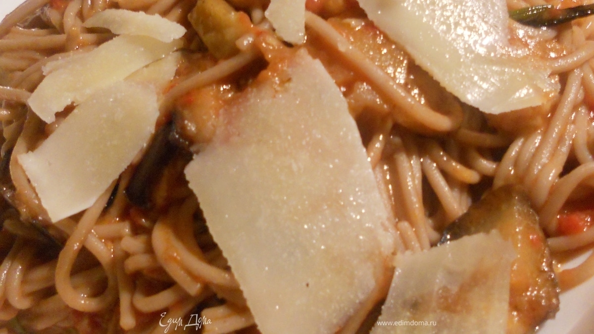 - Шаг 1Чеснок очистить ***и в моей еде чеснок иногда водится - очень редко, но водится!:)))***, раздавить плоской стороной ножа, обжарить на масле несколько минут, вынуть. Баклажан нарезать произвольно (здесь достаточно тонкие кружки, разрезанные пополам), обжарить в той же сковороде, сначала на сильном огне, несколько минут, затем на среднем, до мягкости ***гриль, духовка - тоже отличный вариант***. Добавить томаты вместе с соком, измельченный розмарин, соль, другие специи по Вашему вкусу ***если томаты кисловаты, можно сбалансировать вкус 1/2 ч.л. коричневого или обычного сахара***, готовить без крышки, пока лишняя жидкость не выпарится. Добавить вино (2-3 ст.л.), оставить еще на несколько минут, огонь выключить. ***Вино - это был спонтанный шаг. Сначала мне показалось, что это была не самая лучшая идея и гречневая лапша не очень подружится с ним, но в целом все оказалось неплохо. Но безусловно Вы можете отказаться от этого компонента!*** Сохранять теплыми до подачи. ***Если Вам совесть позволяет, можно добавить немного сливочного масла - сливочные ноты не повредят!***