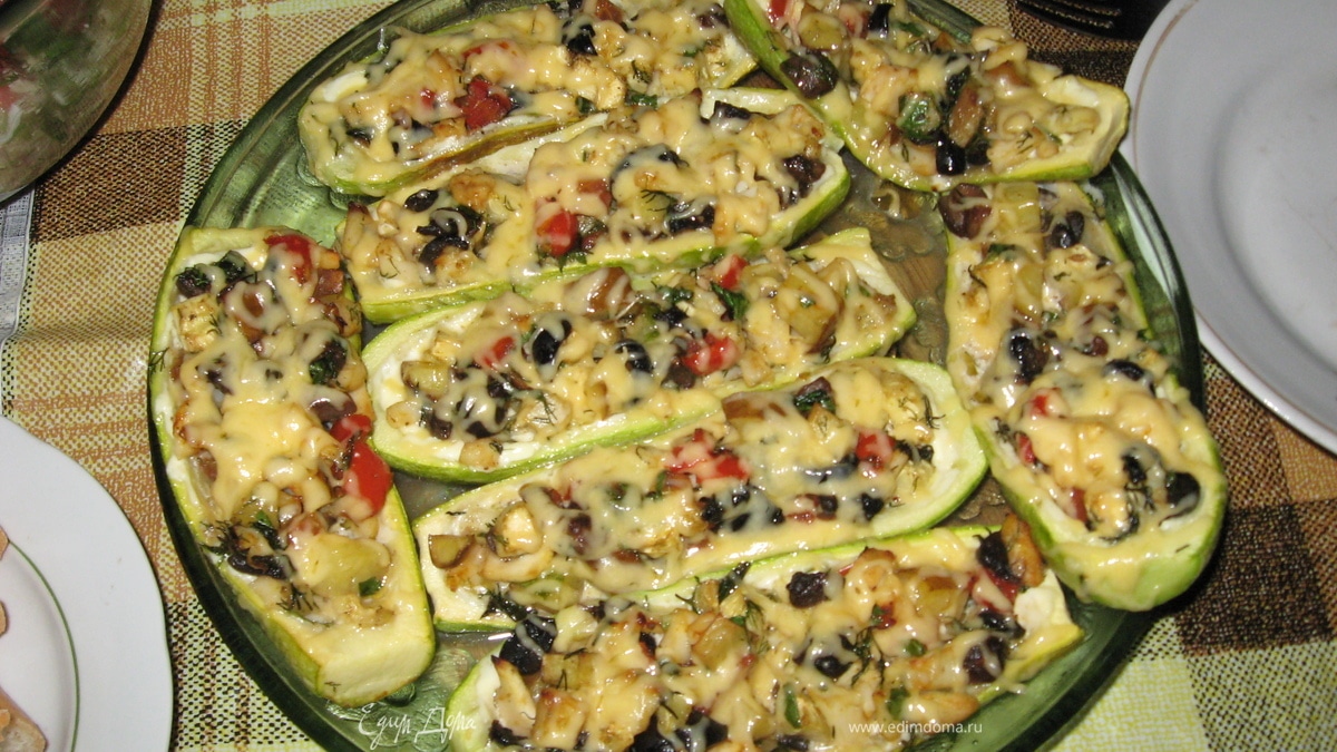 - Шаг 5Выкладываем полученное овощное ассорти в наши лодочки из кабачка.
