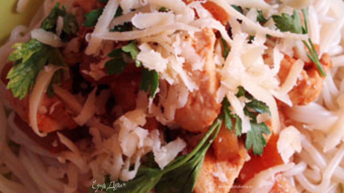 Выложить спагетти на тарелку горкой. Сверху положить курицу. Украсить зеленью. Сверху присыпать натертым сыром.