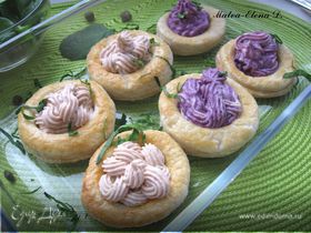 - Шаг 11. Разогреть растительное масло в сковороде до появления легкого дымка. 2. Хлеб нарезать кусочками и обрезать корки (по желанию), мякиш разделить на небольшие кусочки с помощью формы (или нарезать ножом) и обжарить в масле до золотистой корочки. Обжаренный хлеб выложить на салфетку, чтобы убрать лишнее масло из тостов, слегка присолить и сбрызнуть нерафинированным маслом для вкуса. 3. Лук нарезать кольцами, его можно использовать сырым или тоже обжарить в масле. 4. Выложить лук на тосты, сверху положить один из ингредиентов, закрепив его с помощью шпажки, украсить зеленью.