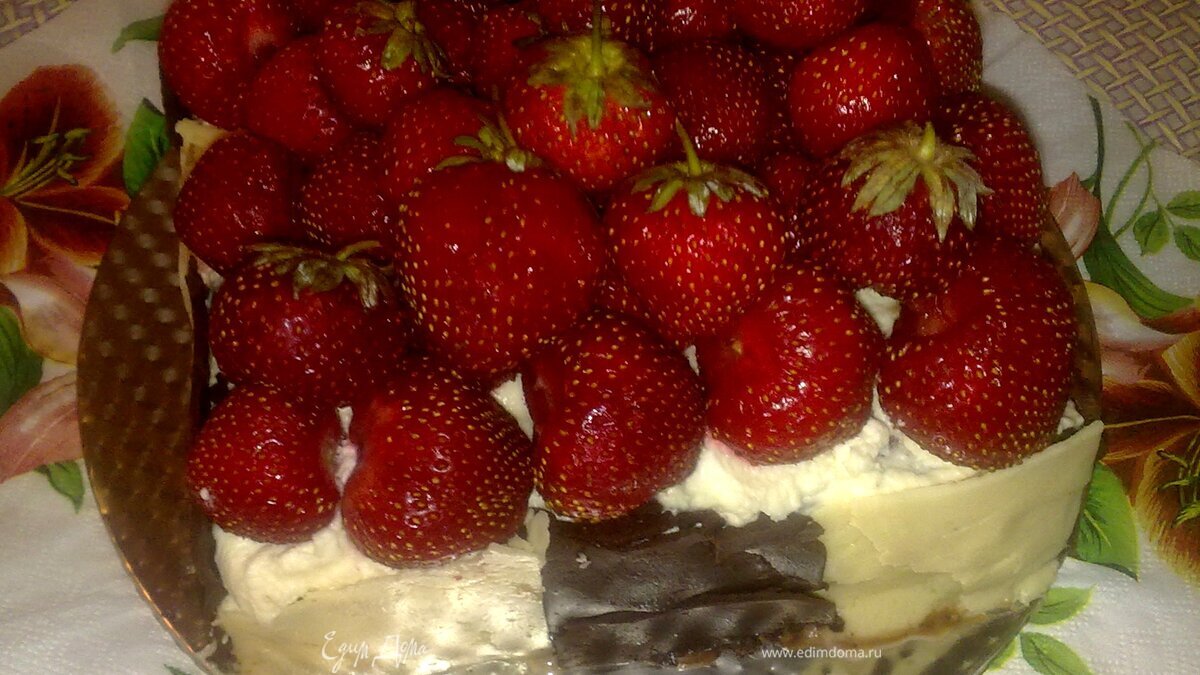 Коржи пропитать сладкой водичкой,на первый корж намазать крем, уложить клубнику, и сверху снова наложить крем, накрыть вторым коржом и его тоже промазать тонким слоем крема - Шаг 7