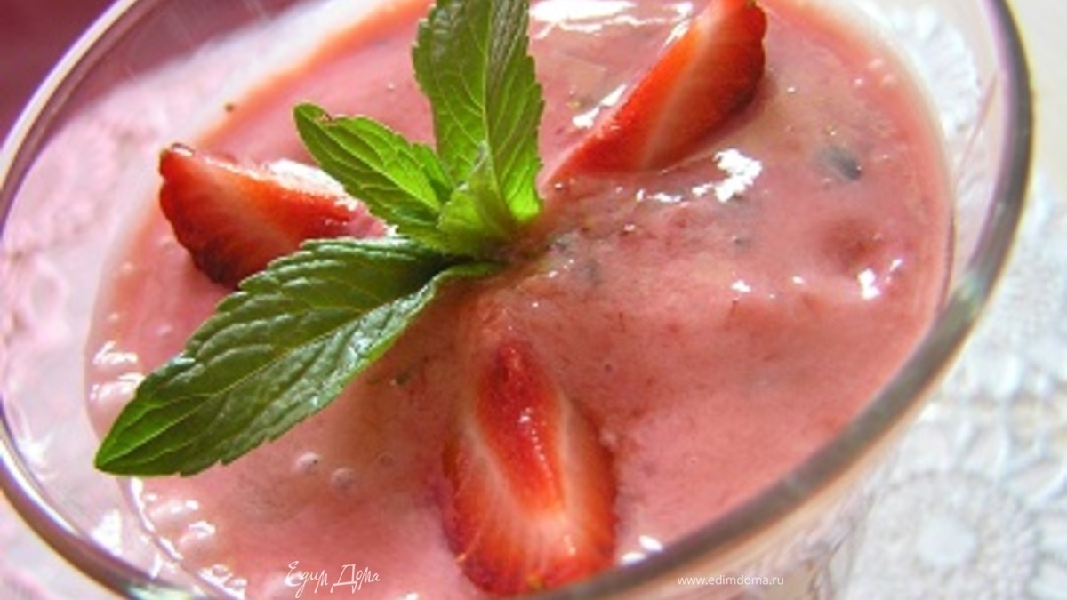 Разлить по бокалам, украсить клубникой и веточкой мяты.