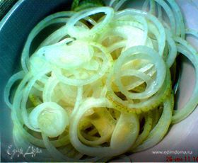 лук нарезать тонкими кольцами и залить маринадом из воды и уксуса на 30 минут в холодильник