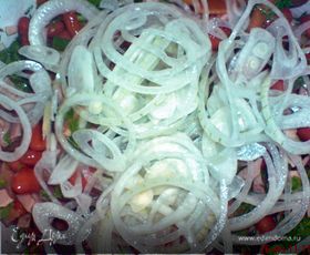 лук освободить от жидкости и добавить к остальным ингредиентам,перемешать