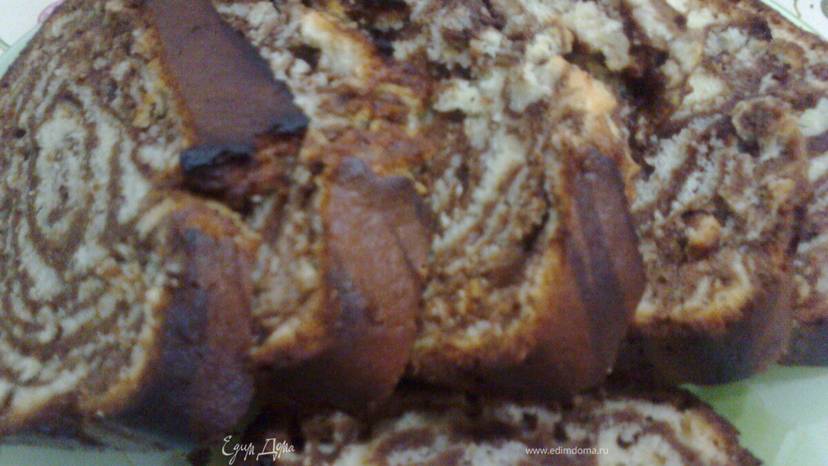 - Шаг 1Яйца и сахар взбить добавить сметану,сгущёнку и растопленное сливочное масло.Муку и разрыхлитель просеять и добавить к основной массе.Всё хорошо перемешать и разделить на две части добавив в одну из частей какао и растопленный шоко.Взять силиконовую форму и столовой ложкой поочерёдно строго по центру выложить светлое и тёмное тесто.Выпекать до готовности.Остывший кекс посыпать сахарной пудрой.