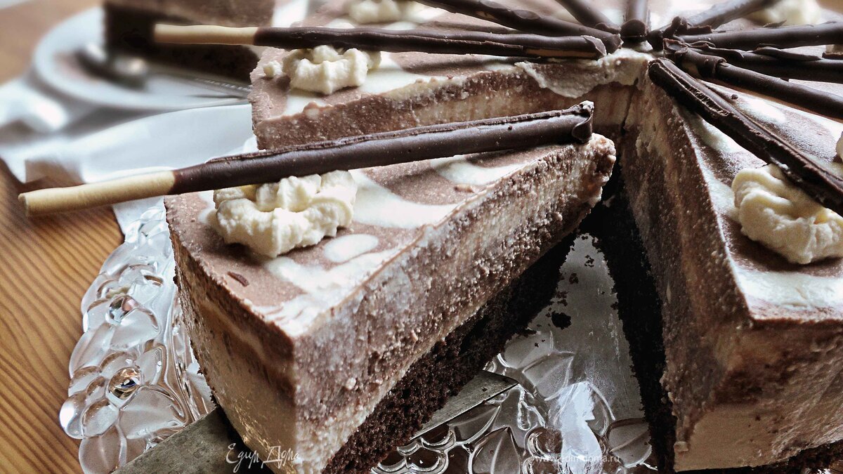 - Шаг 3Достать бисквит из формы, выложить на блюдо и поставить вокруг него бортик формы. Выложить слой белого крема,затем темного. Таким образом чередовать оба крема.Поставить торт на ночь в холодильник. Перед подачей украсить торт розетками из взбитых сливок и хрустящей соломки покрытой шоколадом.