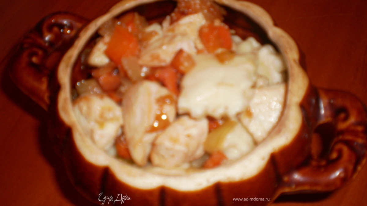 Сложить в горшочки вместе с курицей и овощами, подлить немного бульона и положить сверху сливочное масло. Потушить в духовке 10-15 минут.