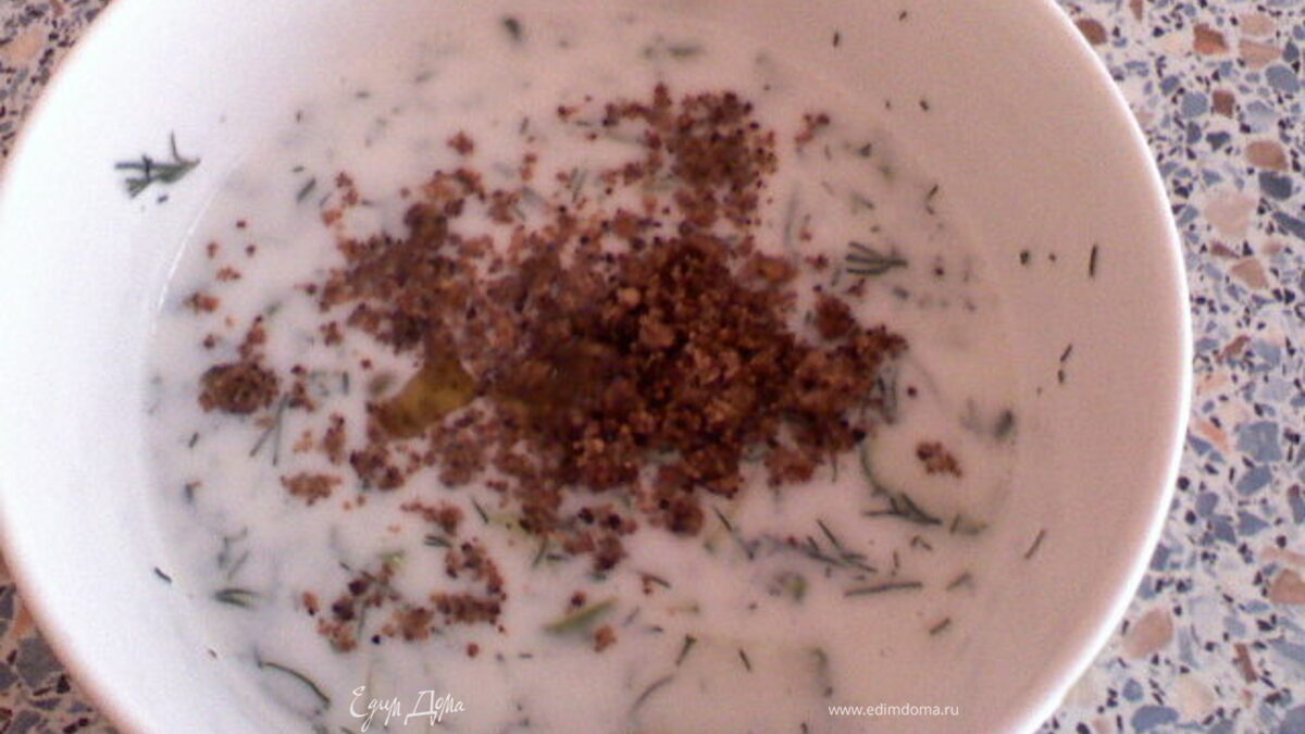 Огурец и укроп мелко нарезать. Чеснок так же измельчить. Орех растолочь. Смешать все ингредиенты, кроме ореха, залить кефиром. Сверху посыпать орехом и капнуть масло. Приятного аппетита!!! Можно так же подавать с гренками, так еще вкуснее.
