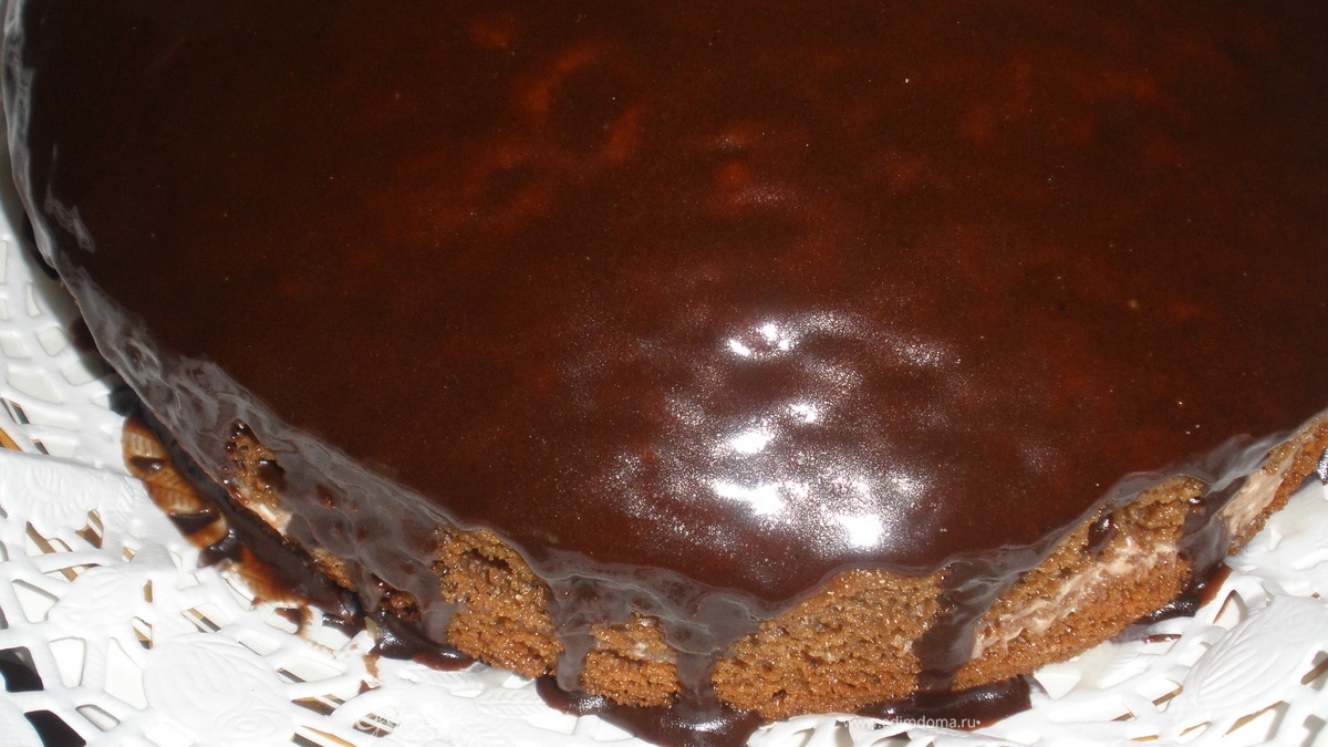 - Шаг 1Яйца растереть с сахаром, постепенно добавляя сгущеное молоко, сметану, соду, какао, муку и замесить тесто. Выпекать около 30 мин при средней температуре. Готовность проверить зубочисткой. Готовый корж должен быть слегка влажный но не оставлять слеов на зубочиске. Разрезать на 2-3 слоя и смазать кремом. Крем: взбить размягченное масло с сгущеным молоком и какао. Сверху торт залить глазурью: закипятьть какао, сахар, воду. Когда слегка уварится снять с огня и добавить масло до полного растворения. Для получения мягкой глазури порцию масла можно увеличить.