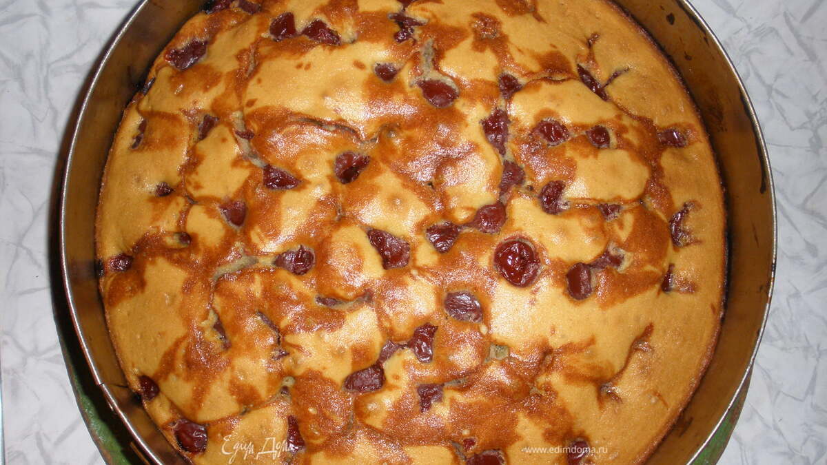 - Шаг 1Размякченное масло взбить с сахаром до образования пышной пены, постепенно добавляя по одному яйца. Постоянно перемешывая ввести просеяную с содой и солью муку. Выложить готовое тесто в смазаную маслом форму, украсить вишнями, слегка вдавливая их в тесто. Выпекать 30 мин 180-200 градусах.