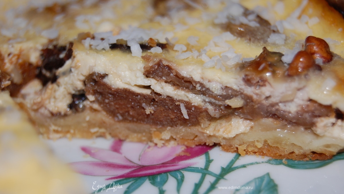 Выложили сухофрукты и грецкие орехи на тесто. Залили кремом, я сверху решила посыпать кокосовой стружкой. Отправляем в разогретую до 180 -200С духовку и выпекаем минут 30-35. - Шаг 1