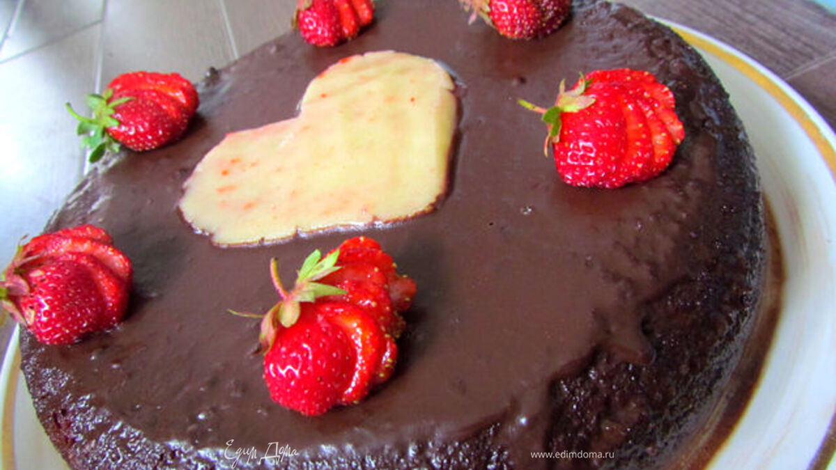 Верх торта покрываем шоколадом растопленным со сливками! Украсить торт можно клубникой. У меня еще для украшения сердце из марципана (очень вкусно)! Торт получается очень сочным и пропитанным. Ему достаточно постоять пару часов и можно пить чай. Но лучше конечно дать постоять ему ночь в холодильнике!