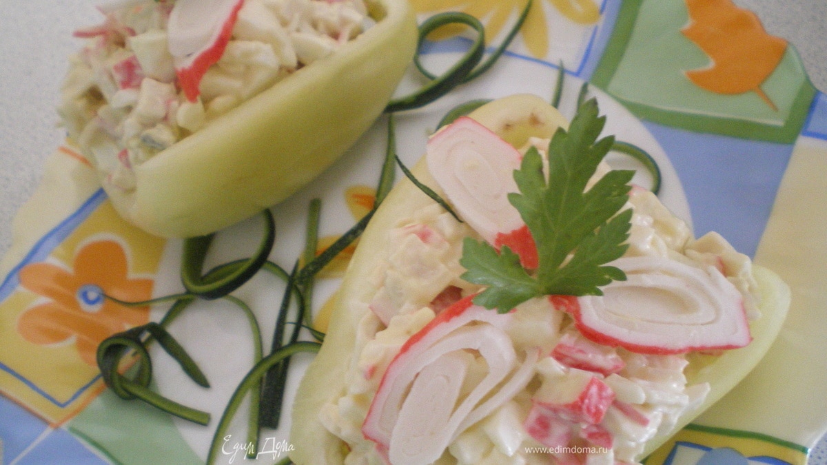 - Шаг 1У перцев удалить семена. Крабовые палочки (мясо) мелко нарезать, яйцо измельчить, сыр натереть на тёрке; всё соединить и заправить майонезом. Нафаршировать готовым салатом перцы и украсить зеленью.