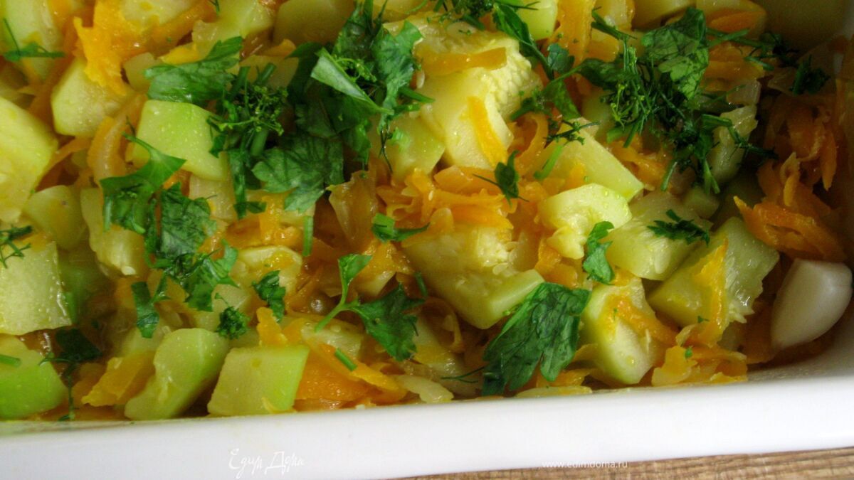 - Шаг 1Переложить овощи в жаропрочную форму, посолить, добавить чеснок, зелень. перемешать. Накрыть фольгой. Выпекать 30 минут при 180 градусах. Готовое блюдо посыпать зеленью.