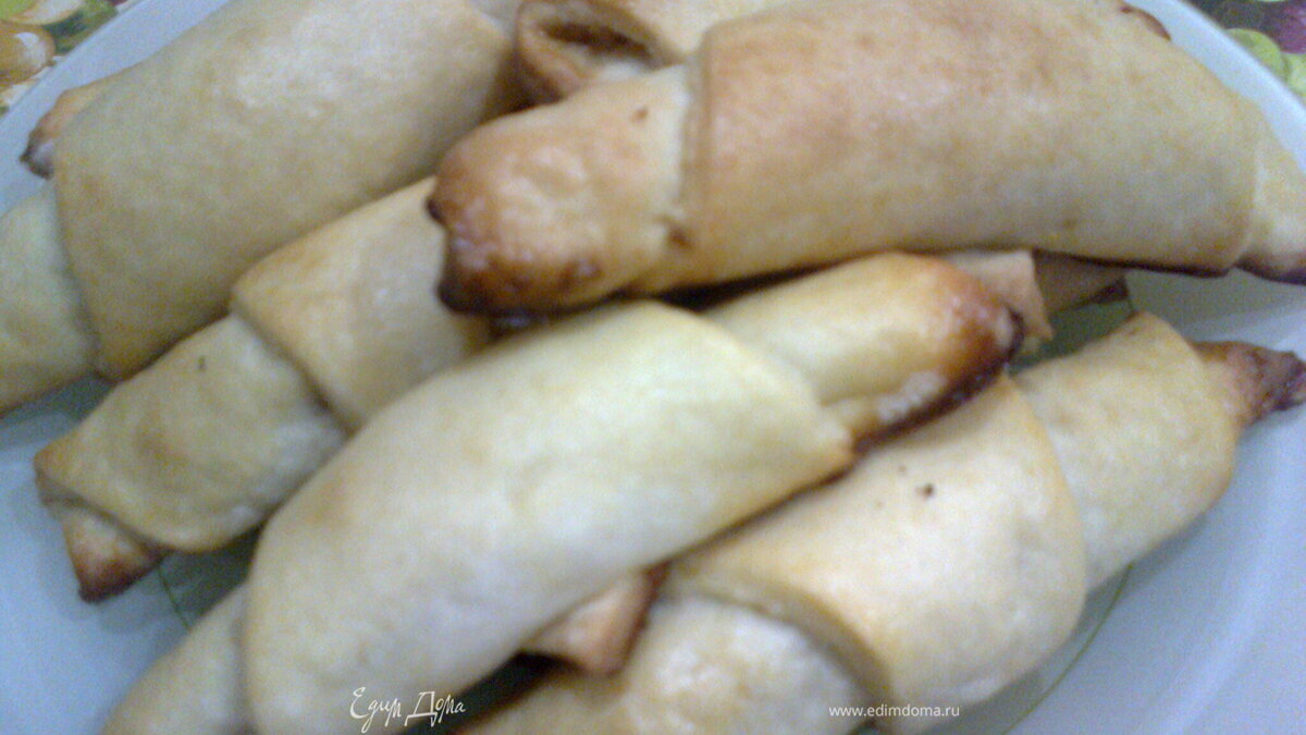 - Шаг 1Сметану растереть с мягким маслом и сахаром добавить просеянную муку и замесить тесто.Пока готовится начинка тесто убрать в холод.Для начинки измельчить орехи и смешать их с сахаром, мёдом и корицей.Достать тесто с холодильника разделить его на шарики.Каждый шарик раскатать в круг и разрезать его на 8 треугольников.На каждый треугольник положить начинку и свернуть в трубочку.Трубочки смазать желтком смешанным с 30г молока и выложить на противень застеленный пергаментной бумагой. Выпекать 30 мин. в разогретой духовке.Готовые трубочки посыпать сахарной пудрой.Приятного аппетита.