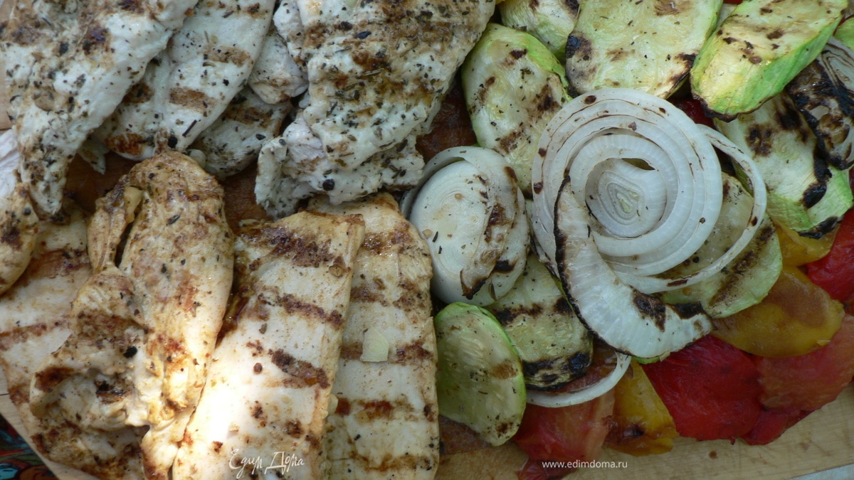 - Шаг 1Как следует разогреть гриль. И овощи, и филе хорошо обжаривать с двух сторон до образования яркого рисунка. Филе требуется для этого не более 2-3 минут на каждую сторону, кабачкам больше. Еще дольше готовиться лук (выкладывать прямо кольцами), перцы (до черноты обжарить со всех сторон, очистить, порезать) и помидор (поступить также, как с перцами, только предварительно наколоть вилкой).