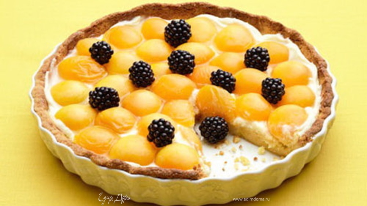 - Шаг 6В готовый корж выложить ровным слоем сырный крем. Вынуть из сиропа абрикосы и уложить поверх крема. Украсить тарт ягодами ежевики.