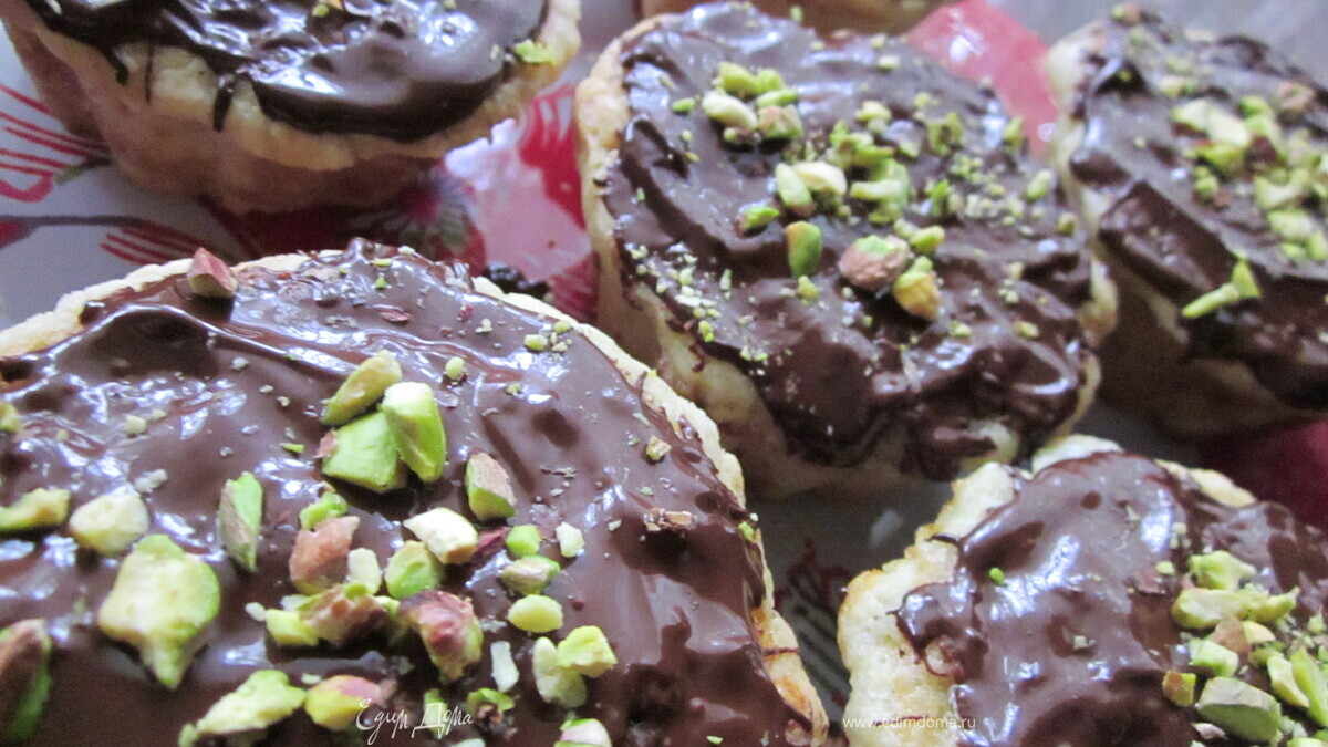 Как только пирожные немного остынут, достаем из формочек и покрываем растопленным горьким шоколадом (я ставлю на минуту в микроволновку),фисташки мелко порубить и украсить пирожные. Все! Пирожные получились очень нежными с мягкой начинкой и с горьким шоколадным вкусом. Приятного аппетита!