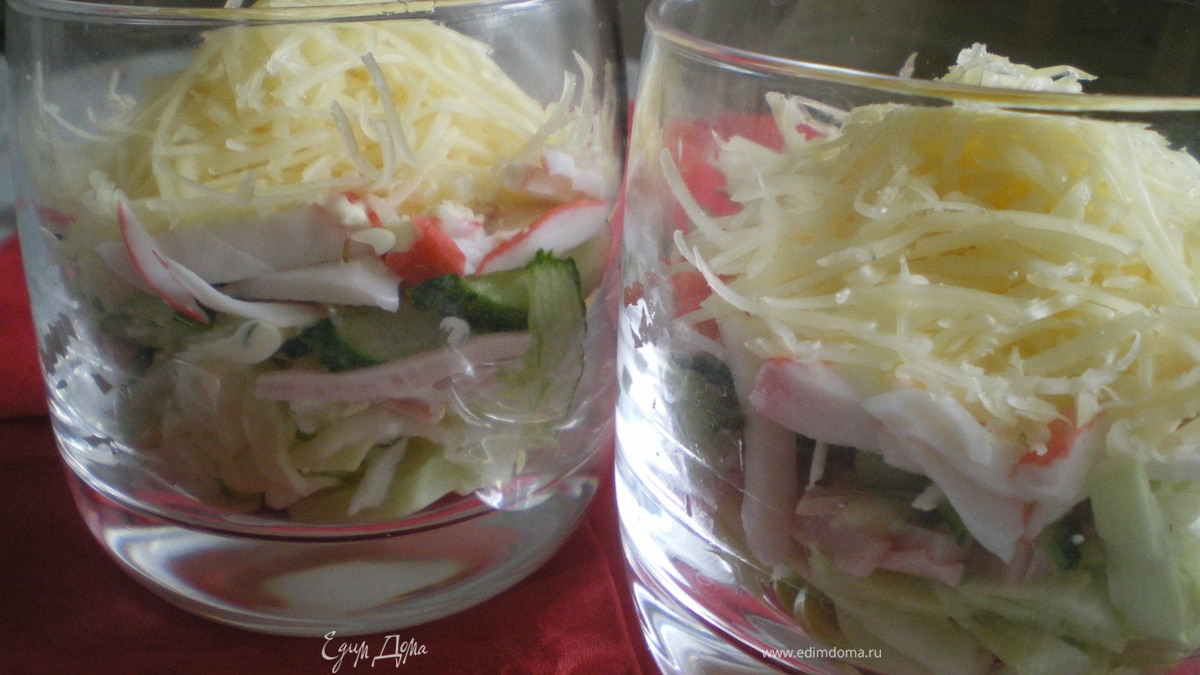 - Шаг 1Все ингредиенты нарезать тонкой соломкой, уложить слоями, промазывая майонезом.