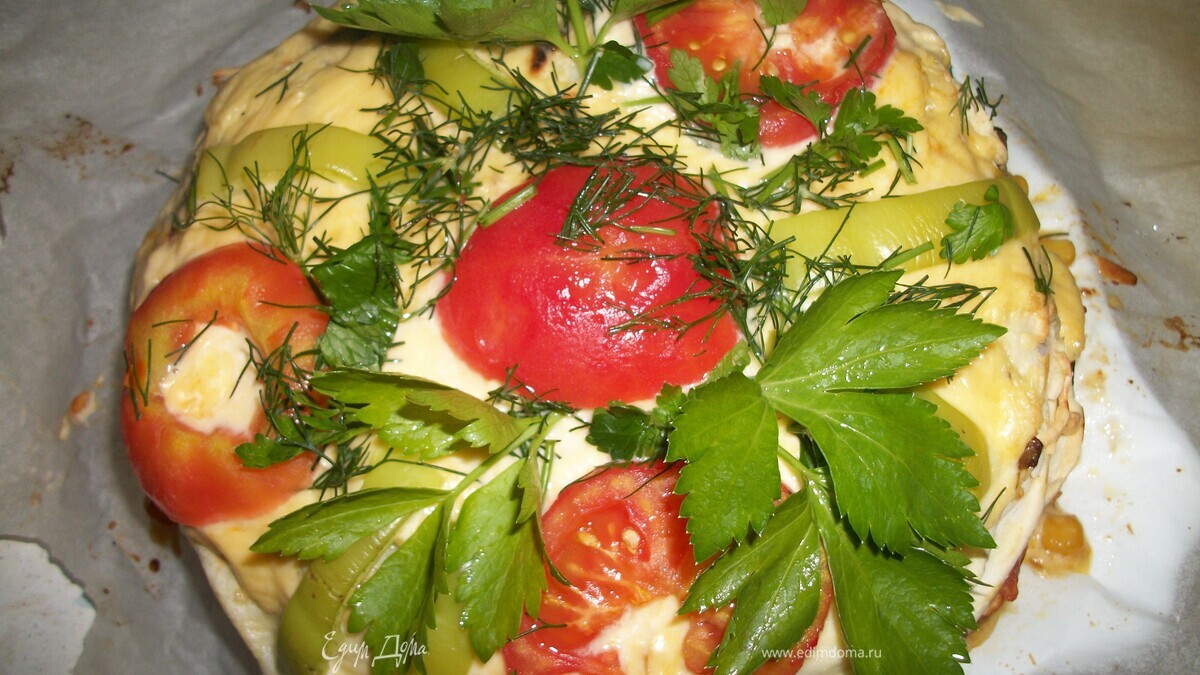 Коржи переложить с начинкой, на последний корж сверху положить начинку,украсить помидорами, перцем, зеленью. Поставить в духовку на 5 минут, чтобы расплавился сыр. - Шаг 10Если делать тортики с разными начинками, необходимо удвоить количество теста.(тесто расчитано на один вариант начинки).