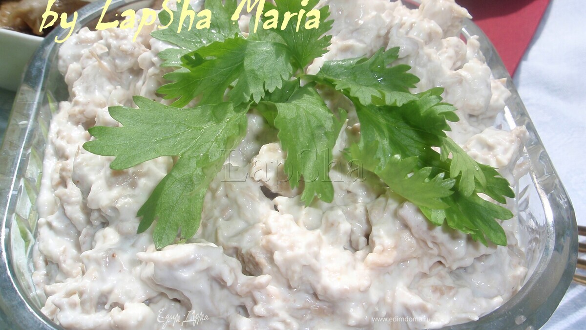 Соус очень прост: Смешаем сметану, майонез и чеснок (выдавленный через чеснокодавку), добавим красного перца. Смешаем все с порезанным мясом и дадим обязательно настояться, чтобы чеснок отдал весь вкус и запах мясу и соусу. Украсить травами или даже добавить очень мелко порубленные (петрушка, кинза, укроп) и приятного аппетита! - Шаг 1