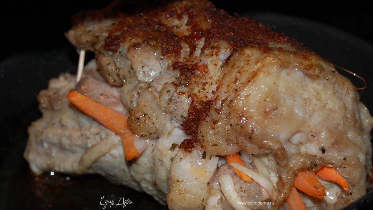 Рулет из свиной грудинки, запеченный с овощами.
