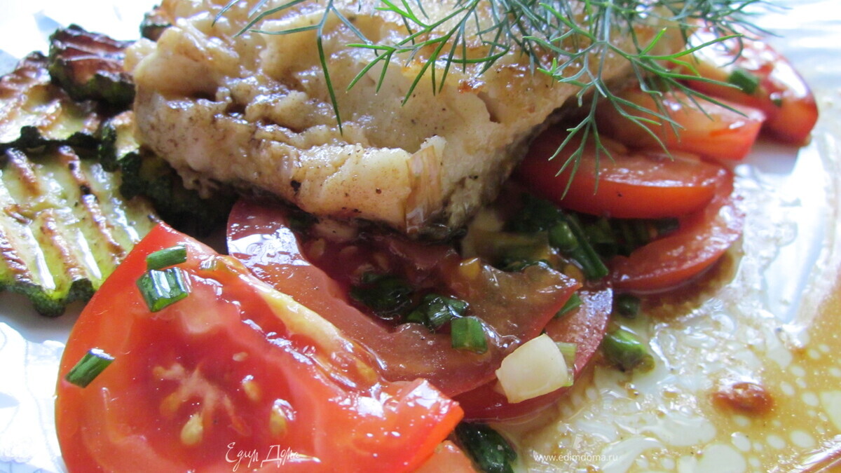 На тарелку выложить салат из томата (соус, в котором мариновался помидор, вылить в сковороду и слегка уварить, этим соусом полить готовое блюдо), рядом выложить жаренный цукини.