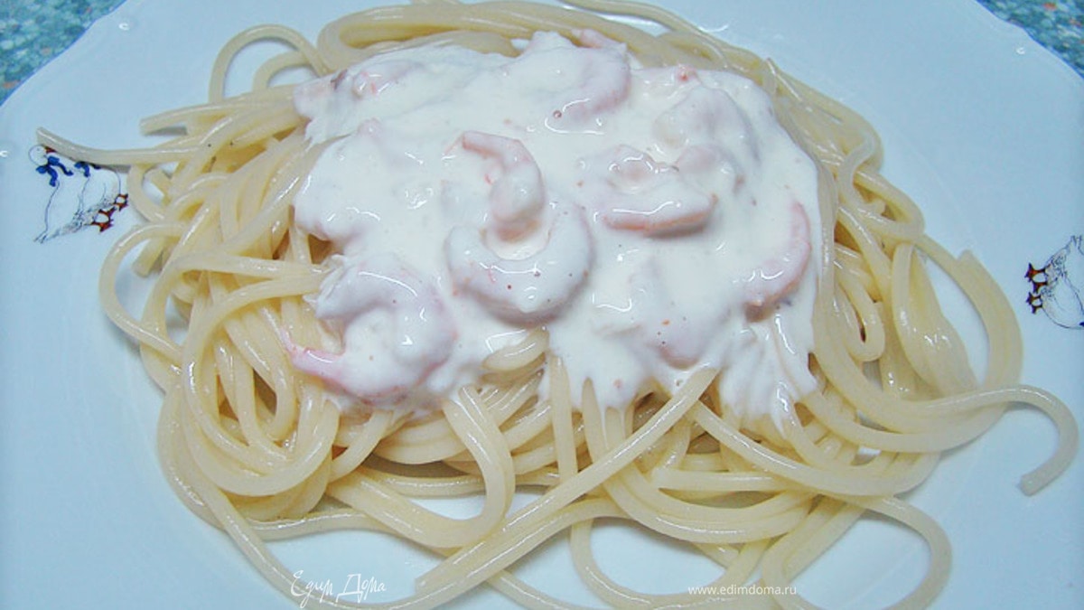 Спагетти с сырно-сливочным соусом и креветками