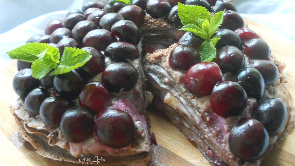 Шоколадный блинный пирог с маскарпоне и черешней