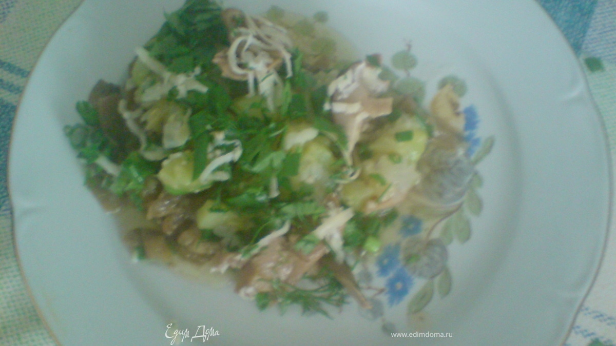 на кабачки слой грибов,зелень и тёртый сыр,посыпанный майораном.охладить. - Шаг 1