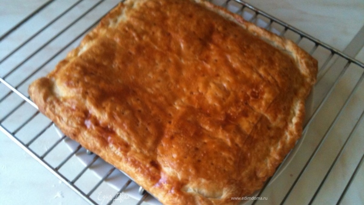 - Шаг 1Накрыть тесто с начинкой второй частью теста. Защипать края. Смазать пирог сверху взбитым яйцом и сделать проколы зубочисткой (достаточно густо)