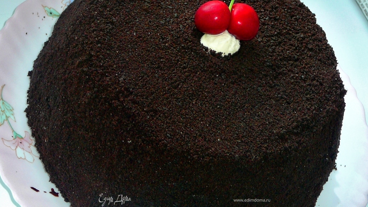 Остать подмерзший торт,застелить большое блюдо пергаменом,поставить на него торт.Покрыть весь торт глазурью.С верху глазурь как бы утрамбовывая присыпать крошками печенья"Орео".Покрыть весть торт,плотно прижимая крошки,чтоб не было просветов.Поставить в холодильник на пару часов.Верх торта можно украсить вишней.