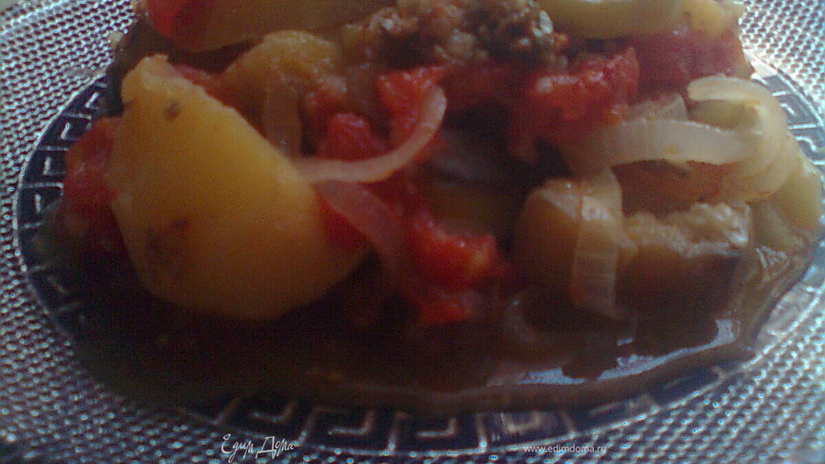 затем начинаем укладывать в кастрюлю или в глубокую скавородку,по порядку,вначале лук,картошку, пяточки,баклажаны,болгарский перец,помидоры,и ещё один слой лука,а с верху положить 100гр сливочного масла,налить пол стакана кипячённой воды,и положить на тихий огонь))) пусть готовиться и порадует нас приятным ароматом)))Приятного апетита)